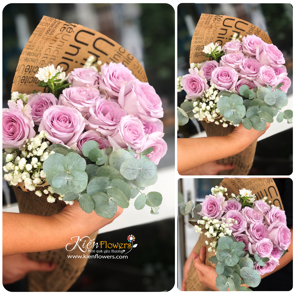 Mã SP gồm các loại hoa:<br> 10 Bông Hồng Tím.<br> Hoa, lá trang trí phụ thêm.<br> Giấy gói.<br>